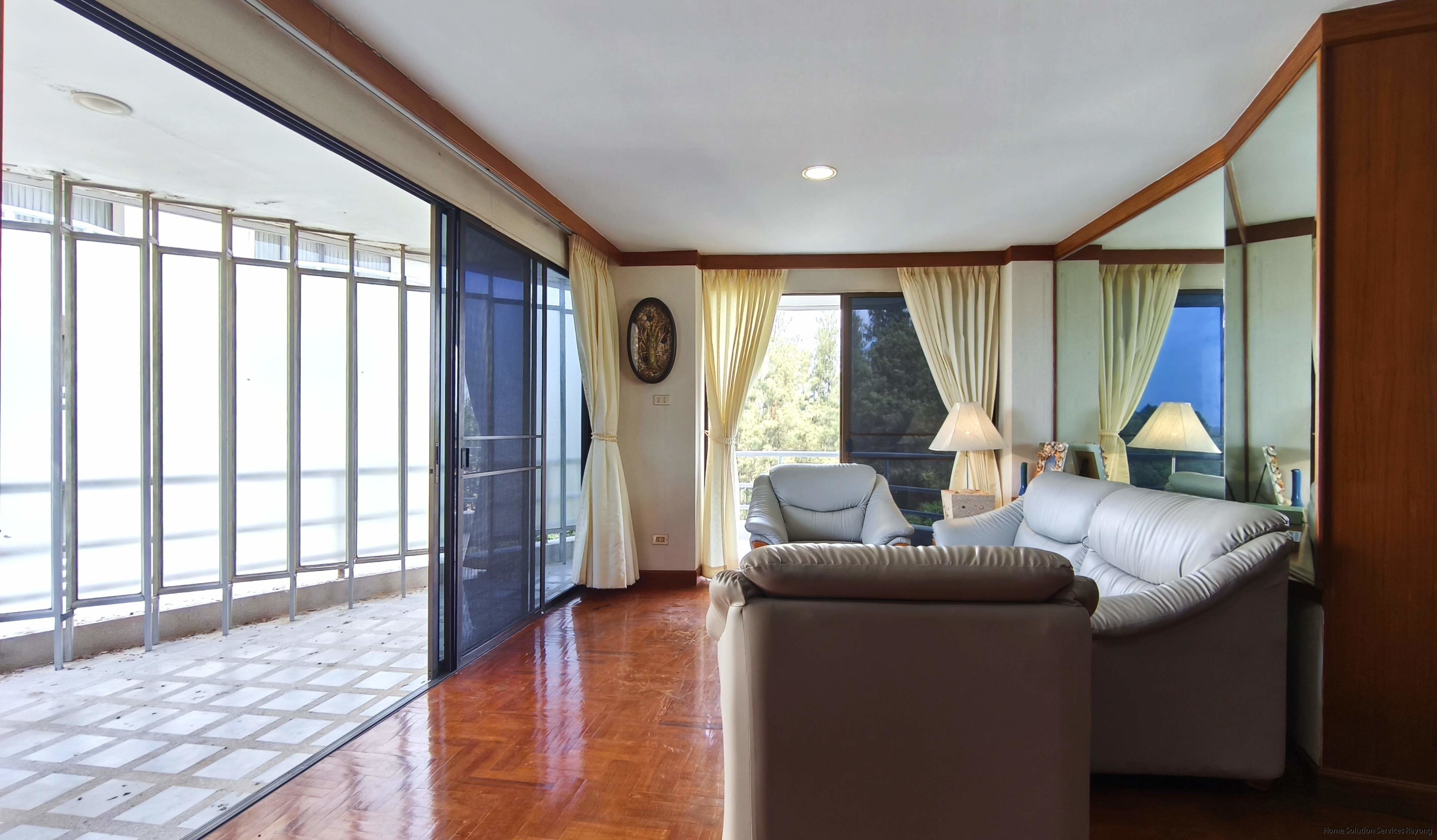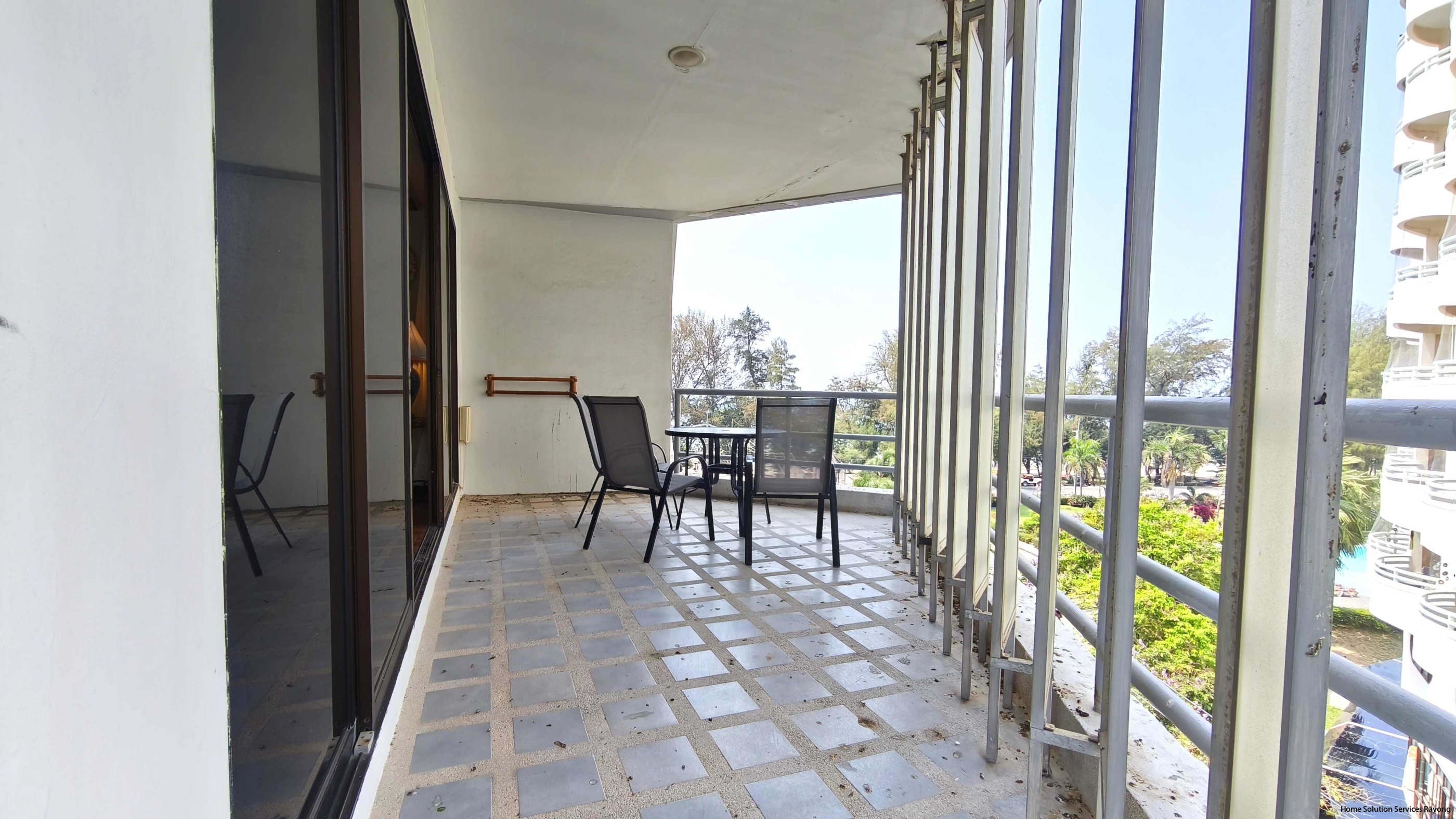 - 1 bedroom condo (114 sqm) in The Royal Rayong Condo on Mae Ramphueng Beach. The condo is located on the 4th floor and offers a great panorama view from the large balcony (28 sqm). Enjoy the space/views with family and friends. There is a BBQ on the balcony.