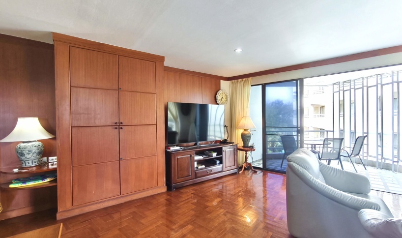 A large living room - comfortable sofa in fron of the TV - slide doors leading out to the large balcony.